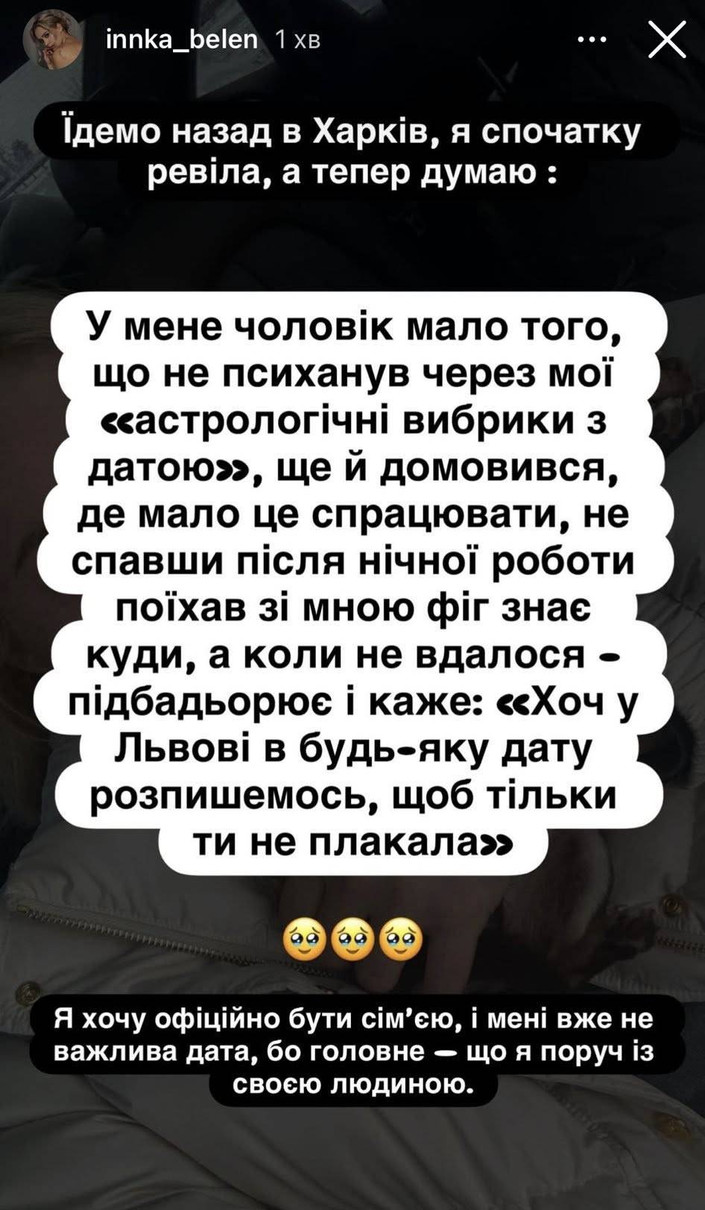 "Тут міг би бути пост з фото і щасливою посмішкою": заплакана Бєлєнь повідомила, що їх із коханим не розписали
