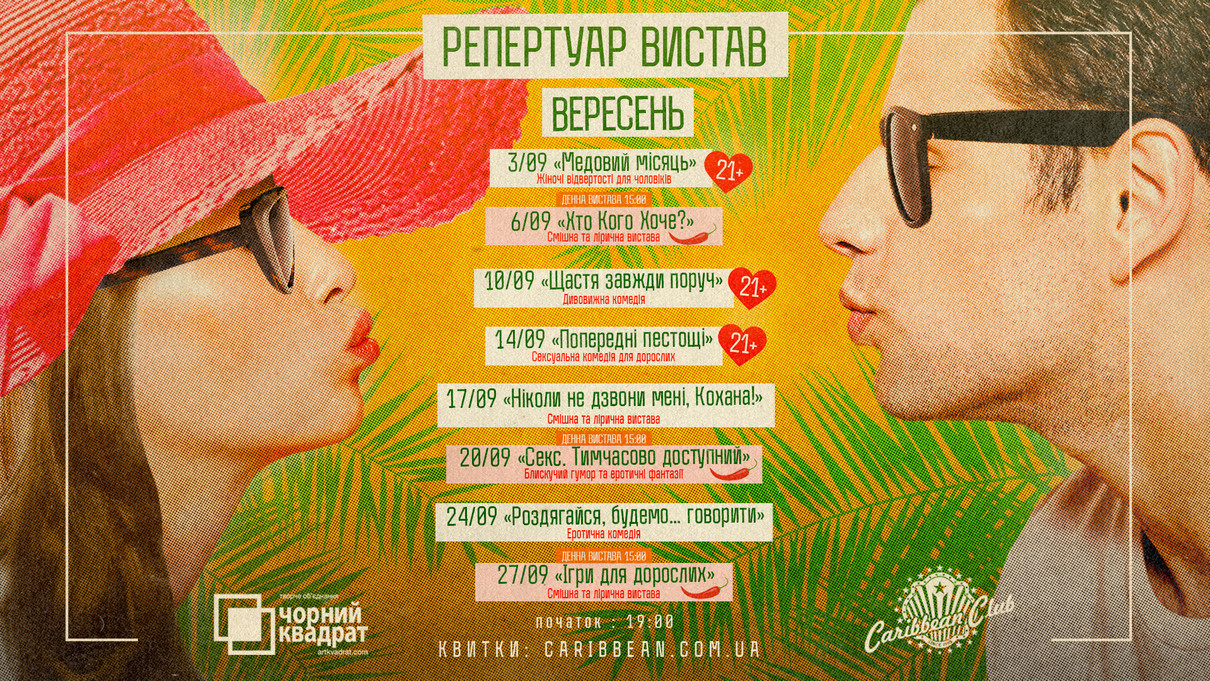 У вересні на сцені Caribbean Club продовжуються вистави від театру "Чорний Квадрат". Він уже понад 30 років залишає за дужками цензуру і прямо говорить про найінтимніше: стосунки, секс, кризи, втрати й надії — усе, із чого складається життя. Саме тому вистави "Чорного Квадрата" стабільно збирають повні зали.