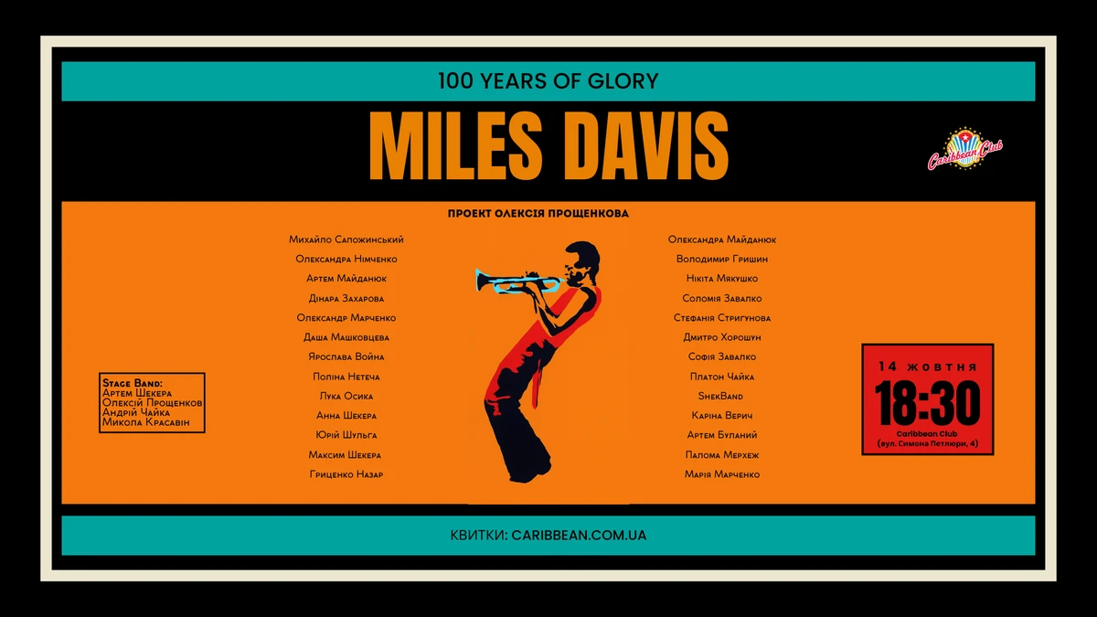 Caribbean Club запрошує на особливу подію до 100-річчя з дня народження Майлза Девіса — одного з найвпливовіших джазменів XX століття. У програмі — культові композиції So What, Bitches Brew та інші знакові треки.