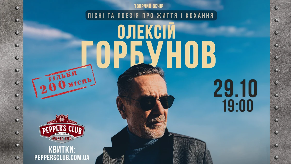 29 жовтня в Pepper’s Club відбудеться акустичний вечір Олексія Горбунова — актора, музиканта і фронтмена гурту "Грусть пілота". Формат виступу — камерний: лише 200 глядачів, живий звук і затишна атмосфера квартирника.
