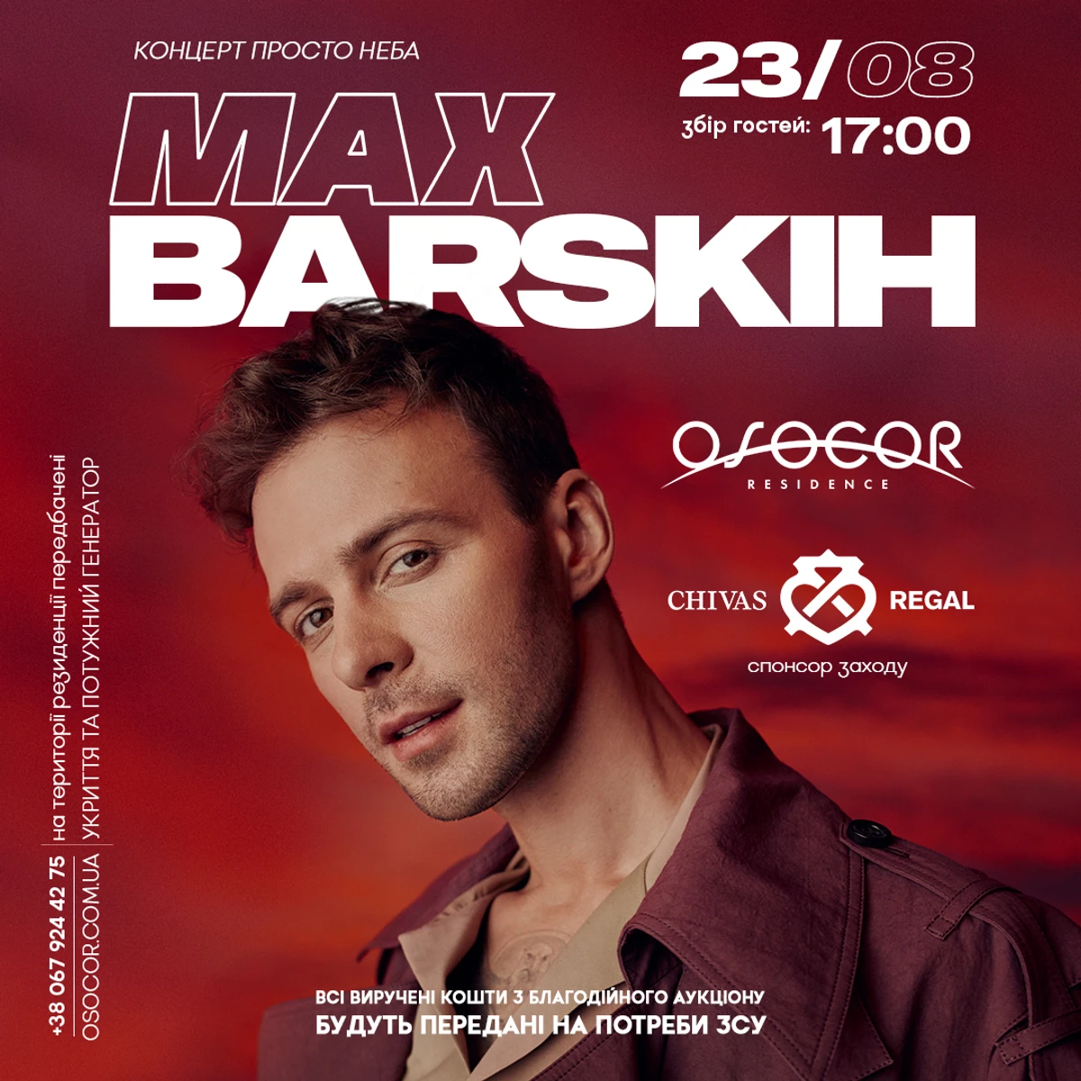 Після гучного концерту Макса Барських у столичному Палаці спорту для 10 тис шанувальників із шоу "Зорепад. На біс", музикант виступить просто неба в Osocor Residence. Open Air артиста запланований на 23 серпня.