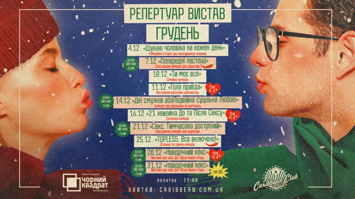 В грудні театр "Чорний Квадрат" продовжить тішити своїх глядачів, дарувати емоції, сміх і можливість розслабитися: 10 грудня — "Ти моє все", 11 грудня — "Гола правда", 14 грудня — "Дві смужки або подвійна суцільна любові", 16 грудня — "21 хвилина до та після сексу", 21 грудня — "Секс. Тимчасово доступний", 25 грудня — "Topless. Все включено!", 28 та 31 грудня — "Новорічний кекс".