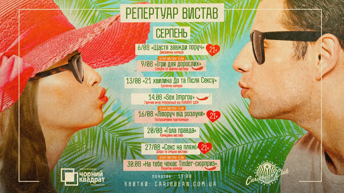 У серпні на сцені Caribbean Club — вистави театру "Чорний Квадрат, який понад 30 років залишається на вістрі гострих тем і відвертих розмов. Щосереди ввечері та в суботу вдень тут грають сміливі, іронічні і впізнавано життєві історії — про кохання, секс, розставання і пошук себе.