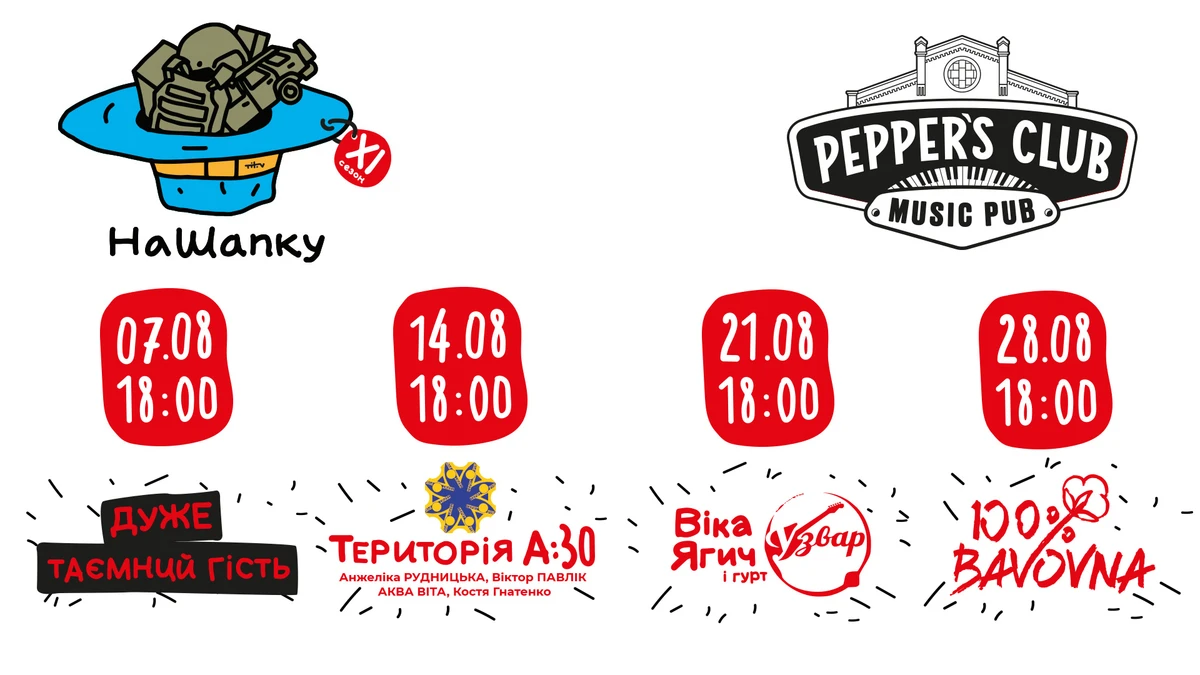 У серпні в Pepper’s Club продовжується серія благодійних концертів #НаШапку — вечорів, де музика об’єднується з доброю справою. Усі події проходять на підтримку фонду "СВОЇ", який збирає кошти на закупівлю кісткових імплантів для поранених українських захисників. Вхід — вільний, під час концертів триває збір донатів.
