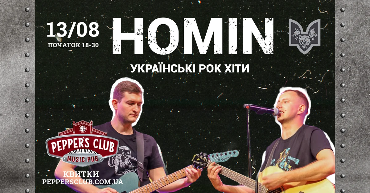 13 серпня на сцені Pepper’s Club — вечір для всіх, хто виріс на "Океанах", співав разом зі "Скрябіним" і пам’ятає кожен акорд "Тартака". Гурт HOMIN зіграє кавери на легендарні українські рок-гурти.