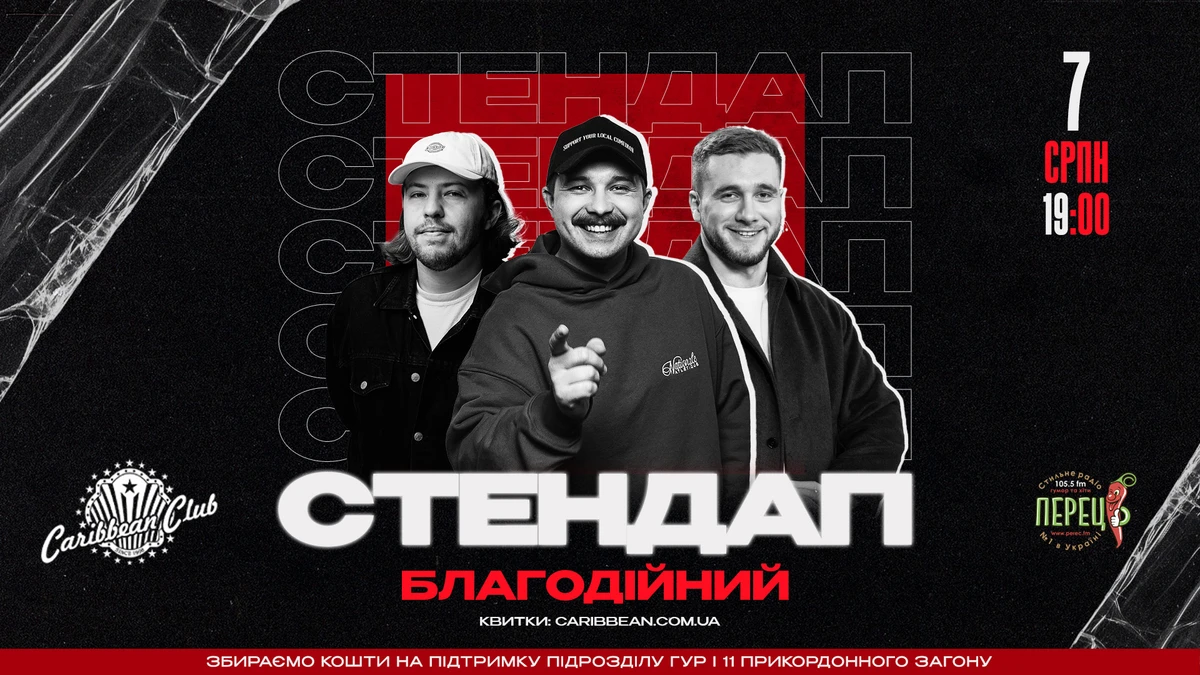 Цього серпня Caribbean Club запрошує на благодійний стендап-вечір, де гумор стає інструментом підтримки українських військових. На сцені — Роман Щербан, харизматичний майстер історій, Тарас Яремій, знайомий багатьом за тіктоками і ютубом, і Богдан Письменко, стендапер із почерком "нахабної інтелігенції" та учасник шоу "Розгони" й "Підкати".