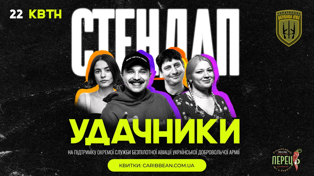Вечір гумору з яскравими стендап-коміками, де кожен квиток = донат для аеророзвідки. На сцені — Ганна Кочегура, Роман Щербан, Нікіта Трандафілов, Катерина Глініна та Аня Кочегура. 100% прибутку буде направлено на збір коштів для аеророзвідки Української Добровольчої Армії. Медіапартнер заходу — радіо Перець FM.