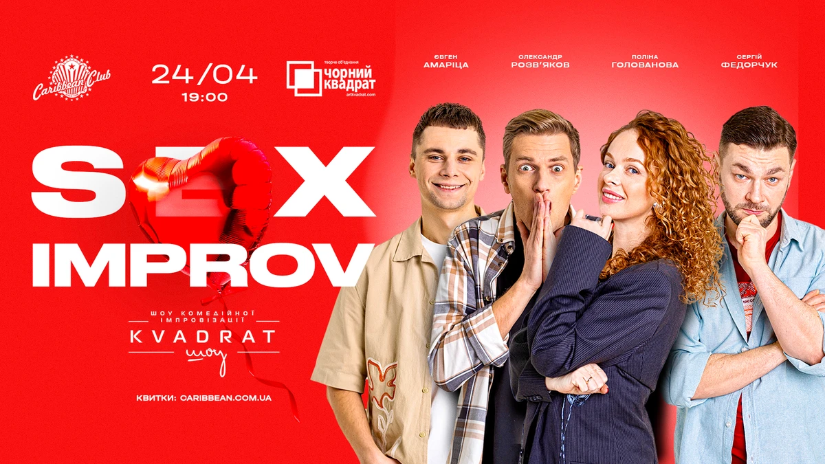 Шоу SEX Improv від Kvadrat шоу — комедійна імпровізація, де глядачі стають творцями вистави. Участь у шоу візьмуть майстри театру "Чорний квадрат" — Женя Амаріца, Сергій Федорчук, Поліна Голованова та Олександр Розвяков.