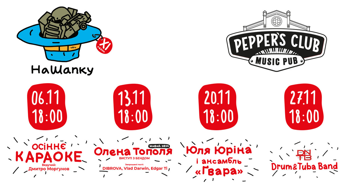 У листопаді Pepper's Club продовжує серію благодійних заходів #НаШапку: 6 листопада відроджуватимуть традицію караоке з ветераном і ведучим Дмитром Моргуновим, 13-го відбудеться виступ Олени Тополі з живим бендом, 20-го — Юля Юріна разом із етноансамблем "Ґвара", а 27-го — вибухові Drum&Tuba Band. Вхід вільний, а всі донати спрямують у фонд "СВОЇ" на кісткові імпланти та медичну допомогу пораненим захисникам.