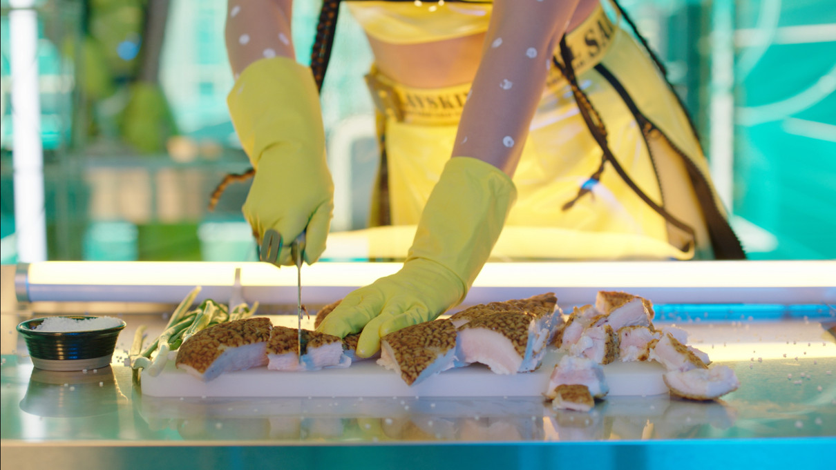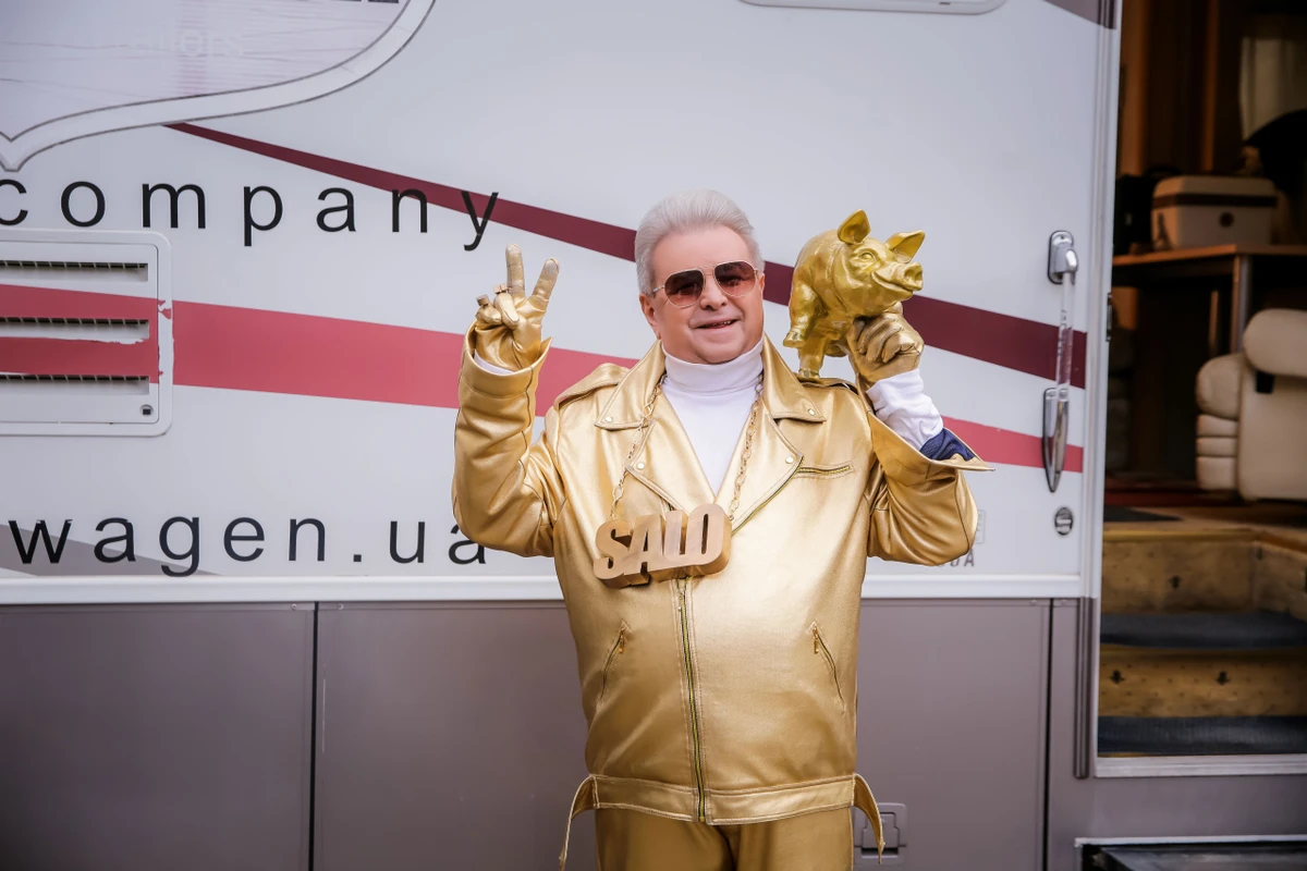За нестандартним режисерським задумом, сало перетворюється на золоті злитки. А Михайло Поплавський постає в стильному образі головного "саломана" країни.