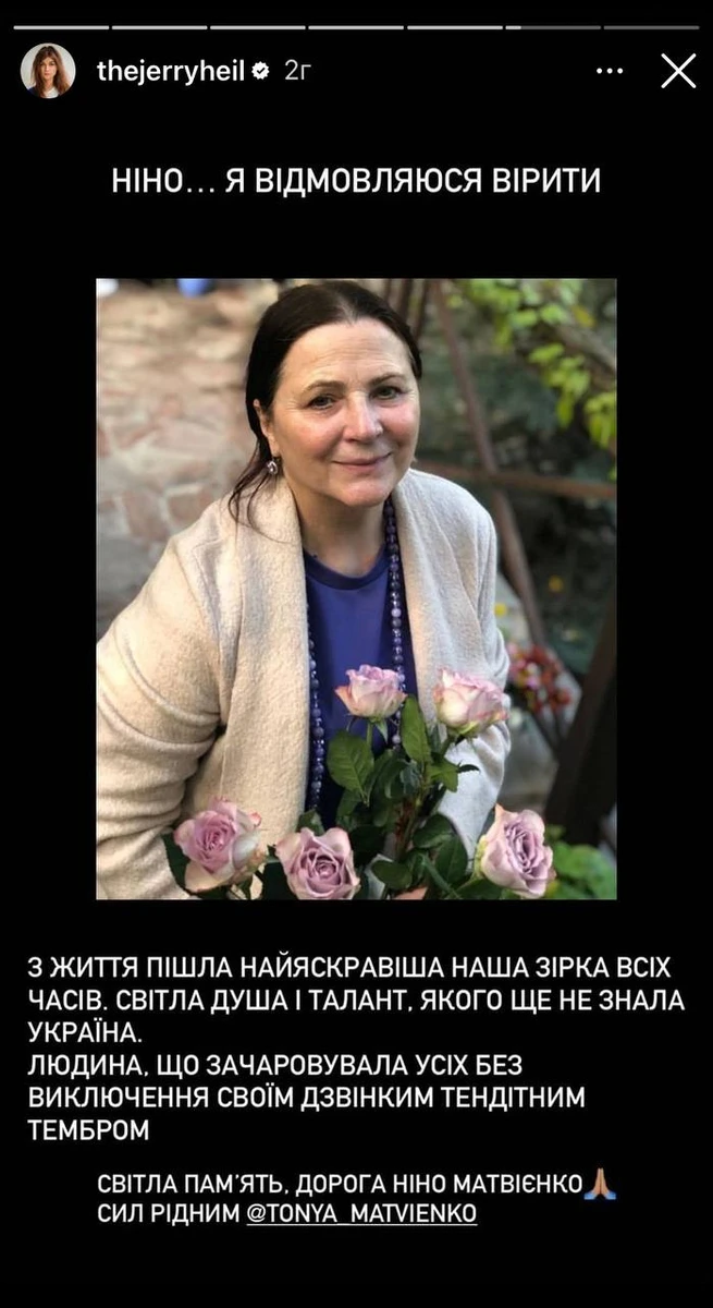 "Сьогодні не стало легендарної, неймовірної й світлої людини — Народної артистки України Ніни Матвієнко!Квітка душа, назавжди залишиться в наших серцях! Світла пам‘ять вам, Велика артистко! І дякуємо за все що ви зробили для української пісні!!" - написав телеведучий Юрій Горбунов.