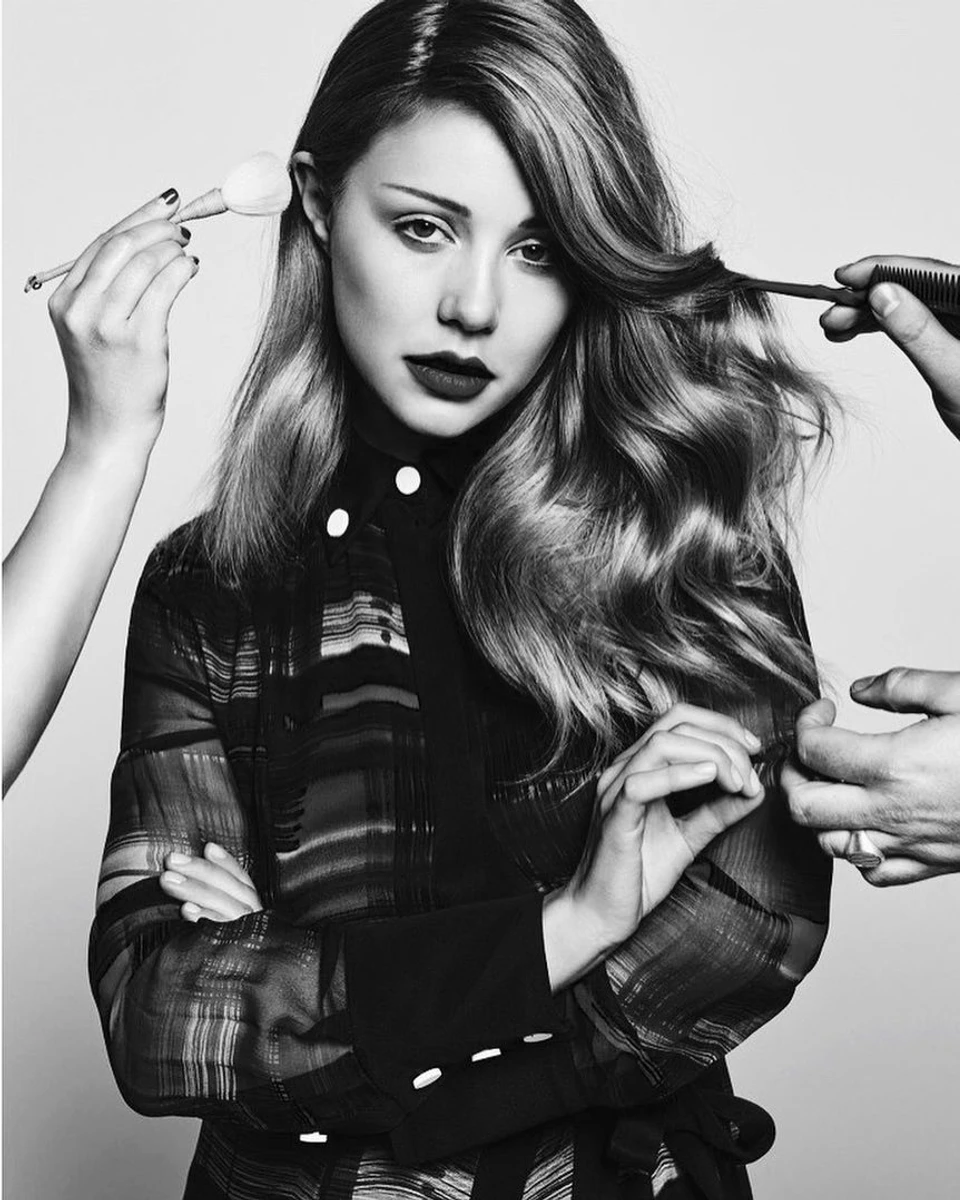 І так, вона могла експериментувати із відтінками свого кольору. Ось тут, наприклад, холодний блонд, який вона доповнювала темним, глибоким макіяжем.