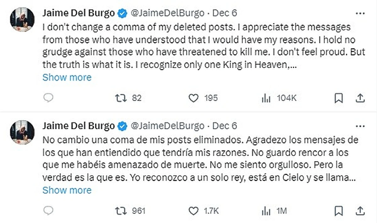 "Я не змінюю жодної коми у видалених мною постах. Я вдячний за повідомлення від тих, хто зрозумів, що в мене були свої причини. Я не маю злості по відношенню до тих, хто погрожує мене вбити. Я не пишаюся. Але правда така як вона є", - написав Хайме у Twitter (X).