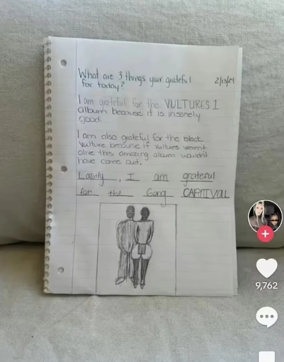10-річна дівчинка зобразила не квіточку, не пташечку, не котика і не улюбленого мультперсонажа, а обкладинку батькового нового альбому "Vultures 1", на якому чинна дружина Каньє, Б'янка Сенсорі красується з оголеною дупцею.