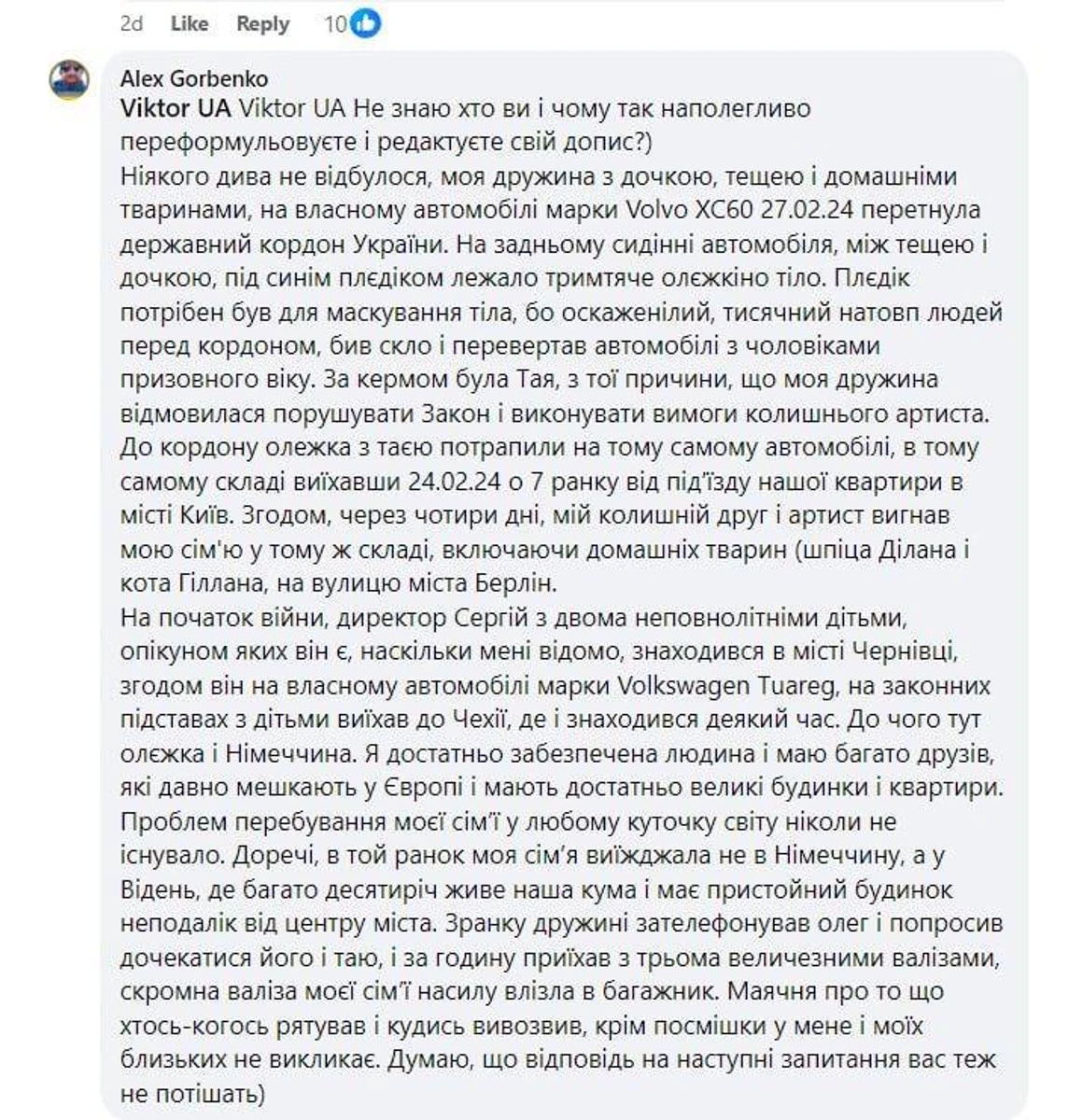 "Моя дружина з дочкою, тещею і домашніми тваринами на власному автомобілі марки Volvo XC60 27 лютого 2024 року перетнула державний кордон України. На задньому сидінні автомобіля між тещею і дочкою, під синім пледиком лежало тремтяче тіло Олежки. Пледик потрібен був для маскування тіла", - написав він.