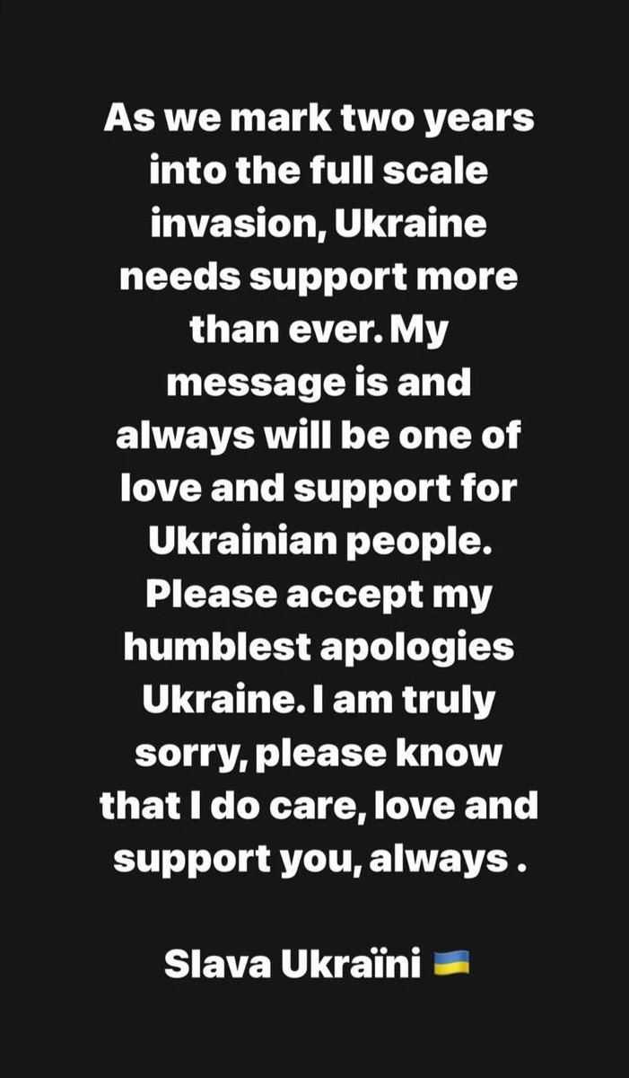 "Привіт усім, я хочу вибачитися перед моїми друзями та шанувальниками в Україні, яких справедливо образив та зачепив мій бездумний пост, в якому я дякувала деяким російським фанатам за худі, яку вони мені зробили, з моїм логотипом і російським прапором.