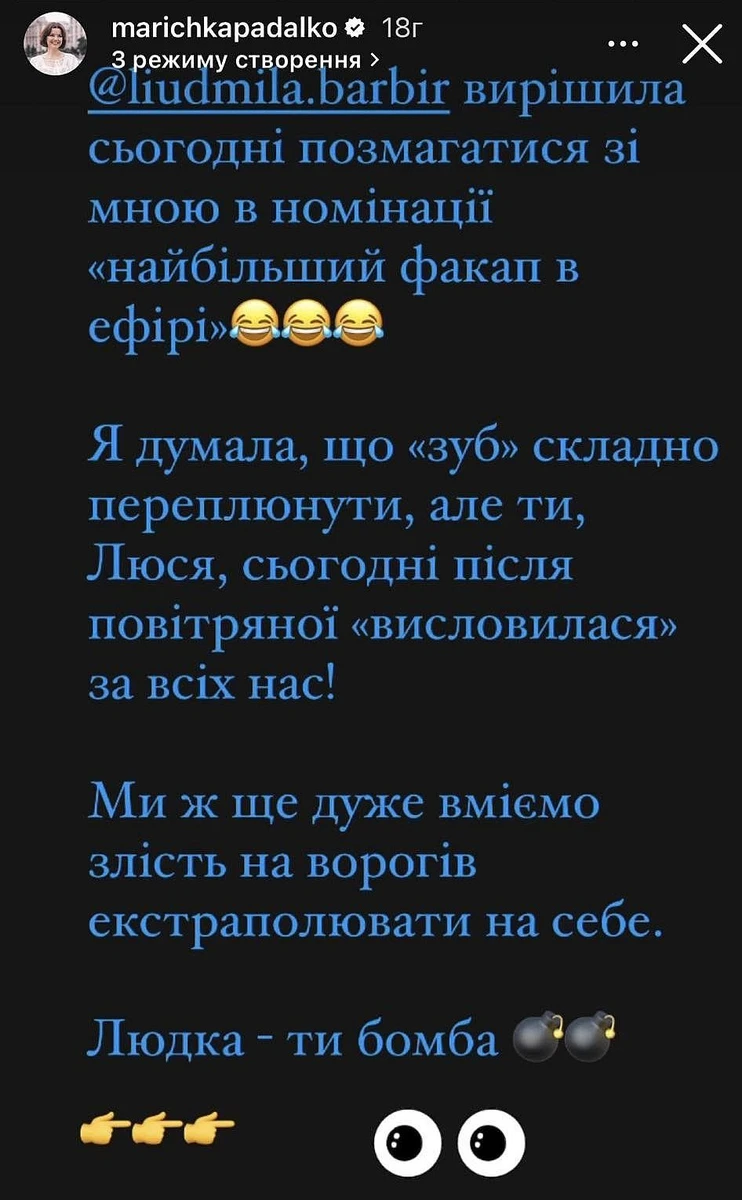 "Людмила Барбір вирішила сьогодні позмагатися зі мною в номінації "найбільший факап у ефірі". Я думала, що зуб складно переплюнути, але ти, Люся, сьогодні після повітряної "висловилася" за всіх нас! Ми ж ще дуже вміємо злість на ворогів екстраполювати на себе. Людка - ти бомба!", - написала Марічка.