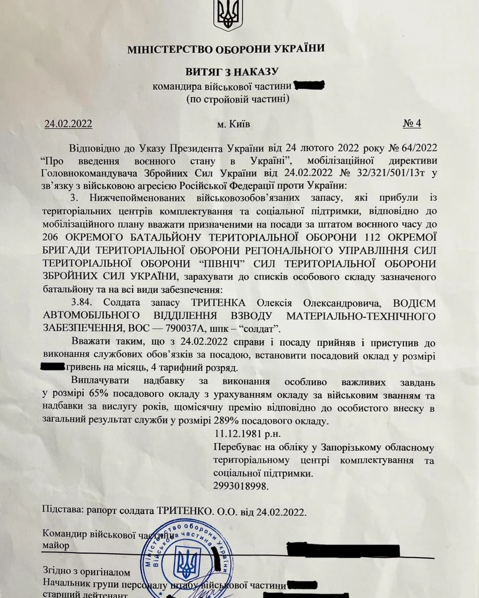 Олексій показав відповідний наказ, що засвідчує, що він є військовослужбовцем. Як пояснив чоловік, він служить на фронті молодшим сержантом.