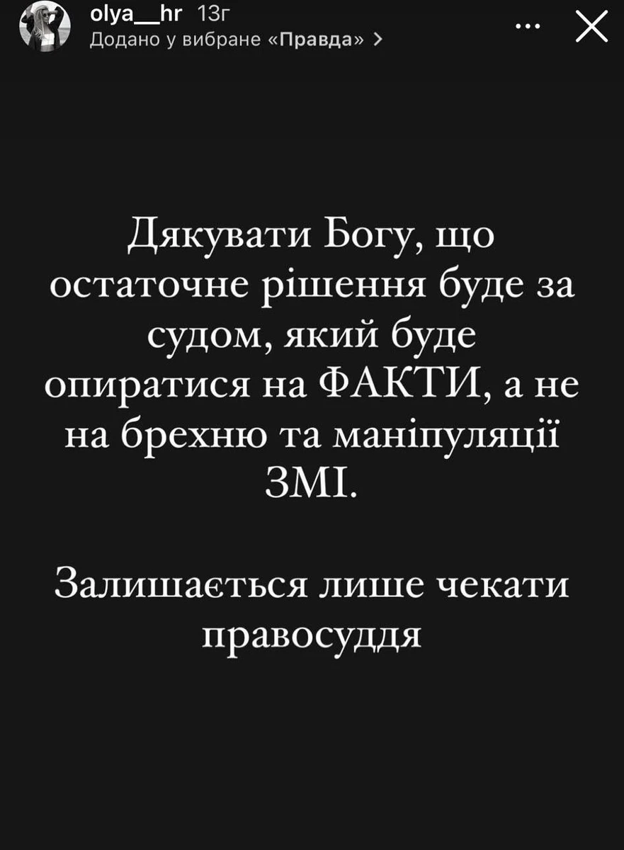 "Дякувати Богу, що остаточне рішення буде за судом, який буде опиратися на ФАКТИ, а не на брехню та маніпуляції ЗМІ. Залишається лише чекати правосуддя", - заявила Ольга.