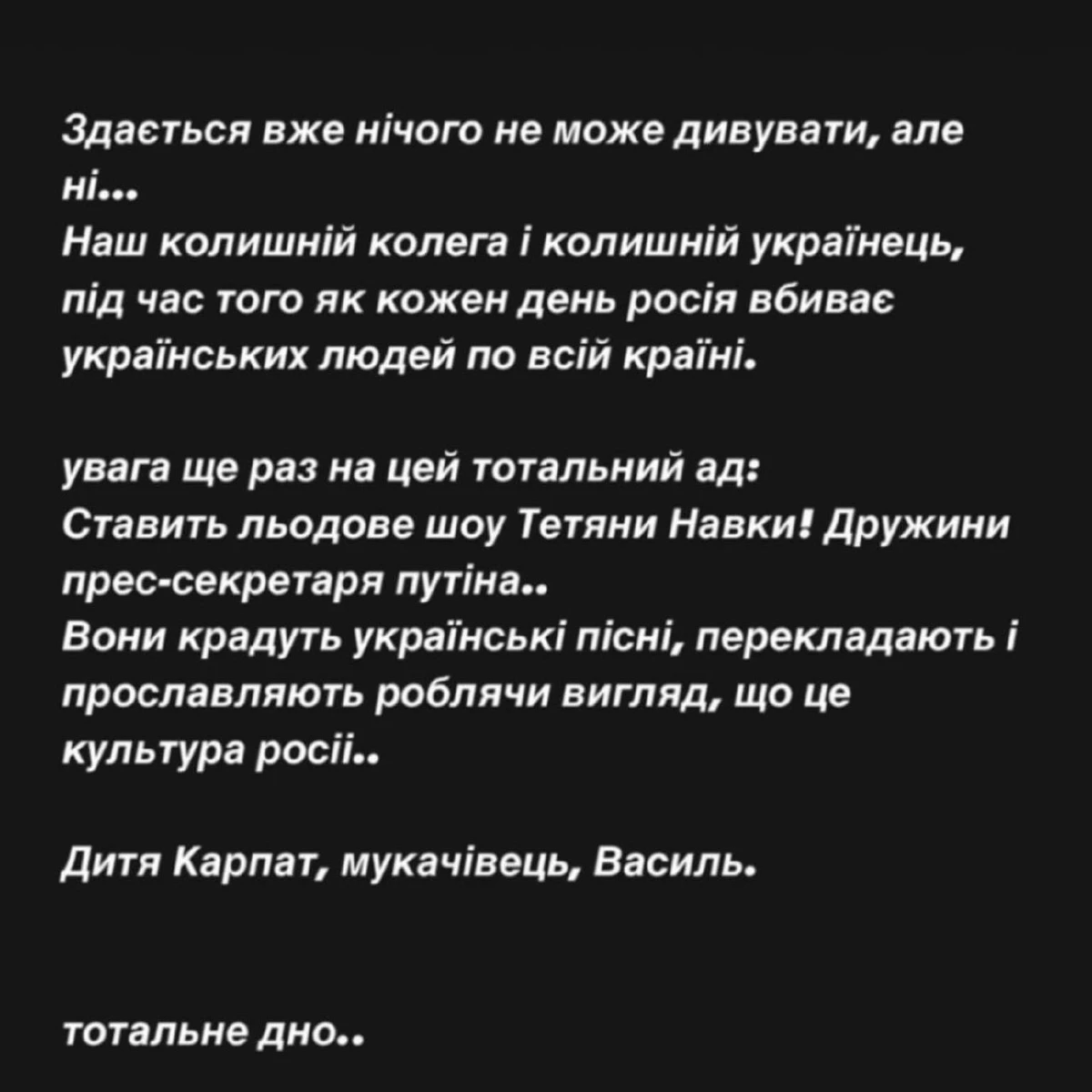 "Якщо хтось не до кінця розуміє, чого мене чорти взяли, нібито ми мали вже звикнути, що росіяни у нас все крадуть, то уявіть собі, що ця Навка візьме своє льодове шоу і прокатає його, наприклад, країнами Європи. Німеччина, Австрія, хто там іще приймає русню.