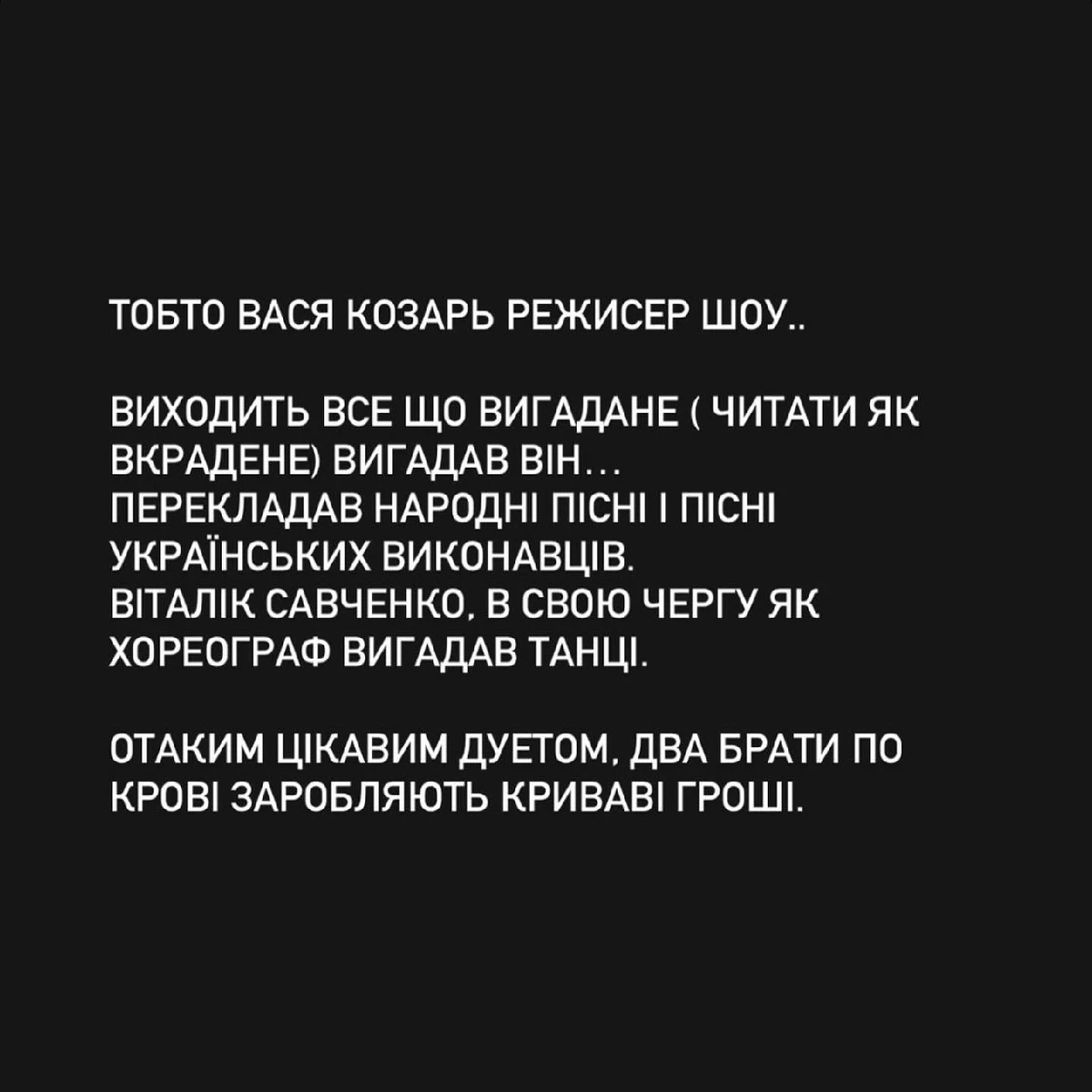 Для мене це колись була людина, якій я повністю довіряла, була віддана на всі 100%. Як я потрапила до нього в балет ("Kozar Dance Theatre"), так і була в ньому до тих пір, поки Вася не поїхав, це була моя сімʼя", - зазначила вона.