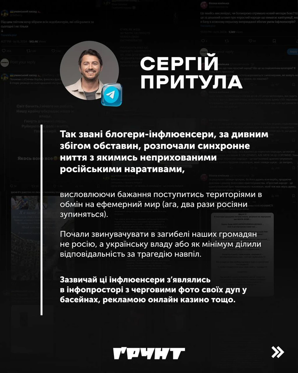 "Так звані блогери-інфлюенсери, за дивним збігом обставин, розпочали синхронне ниття з якимись неприхованими російськими наративами... Зазвичай ці інфлюенсери зʼявлялись в інфопросторі з черговими фото своїх дуп у басейнах, рекламою онлайн казино тощо", - прокоментував Притула.