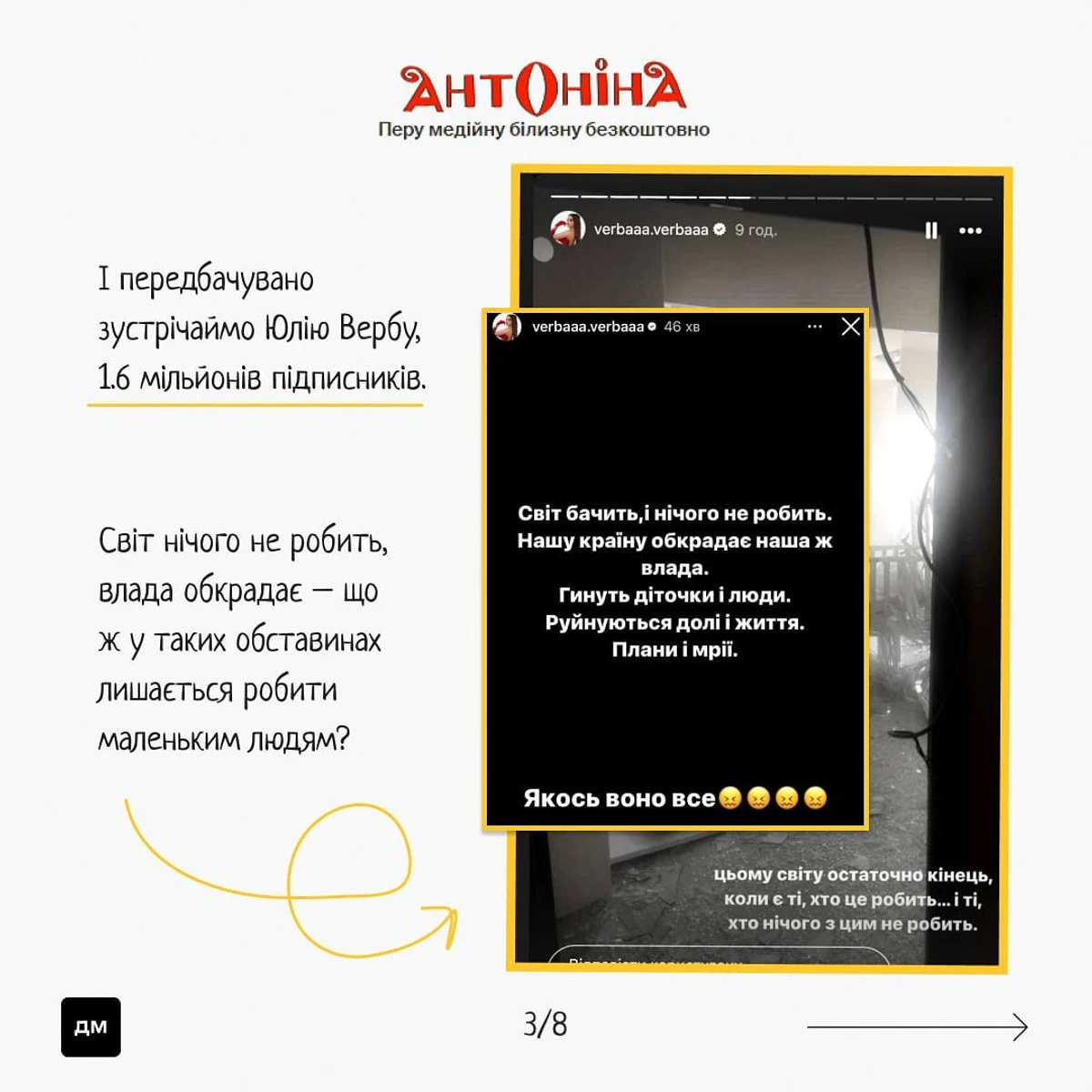 "Світ бачить, і нічого не робить. Нашу країну обкрадає наша ж влада. Гинуть діточки і люди. Руйнуються долі і життя. Плани і мрії", - відреагувала Верба.