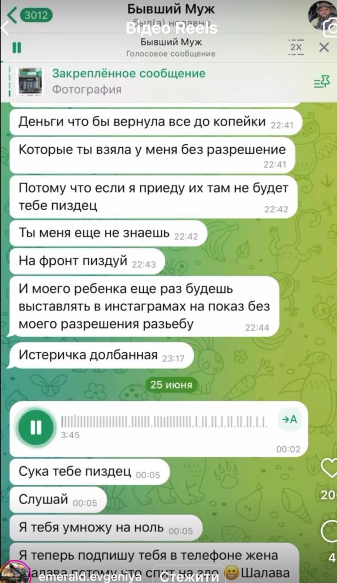 "Підірву тебе": Емеральд оприлюднила аудіоповідомлення з погрозами від екса-військового