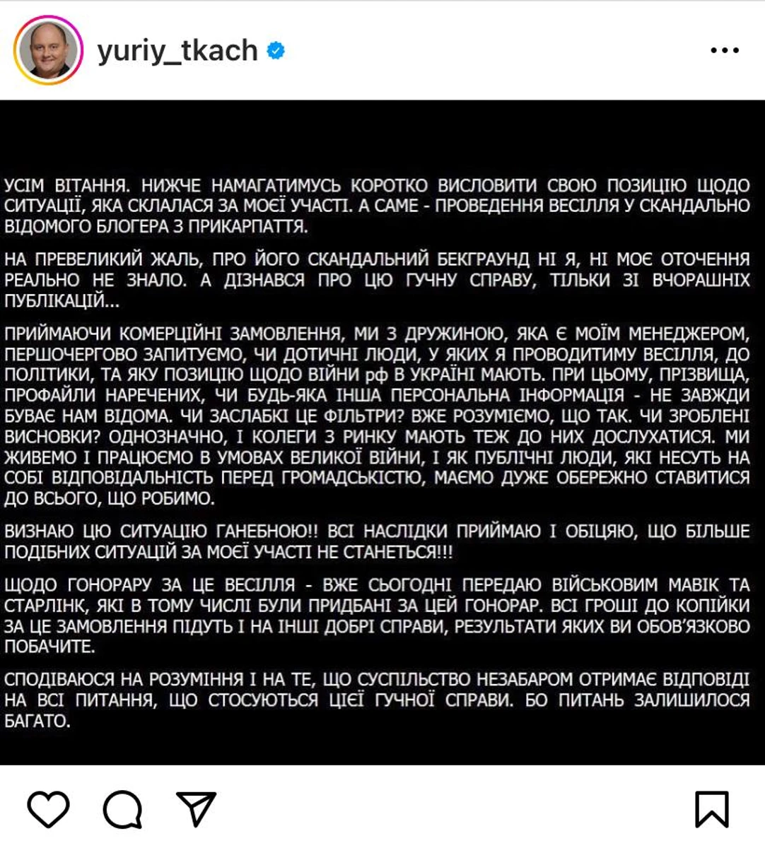 Ткач додає, що всі гроші, які йому заплатили на цьому весіллі, підуть на інші добрі справи і пообіцяв показати результати.